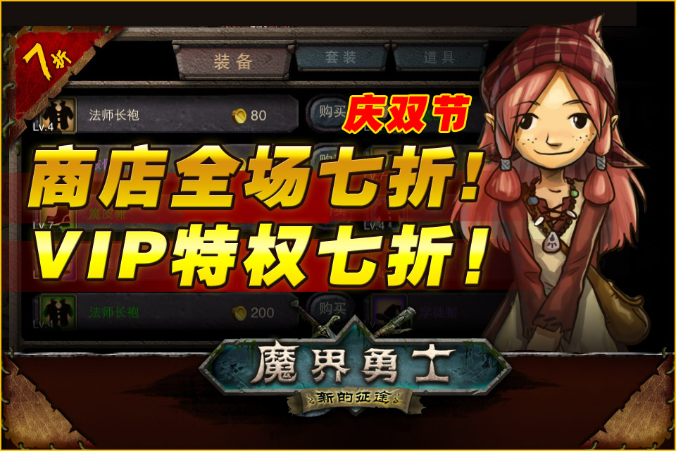 活动内容:活动期间,游戏内道具“商店”所有物品(套装、装备、各种卷轴和道具等)均七折出售。购买VIP特权同样享受7折限时特惠!限时特惠,只在双节!